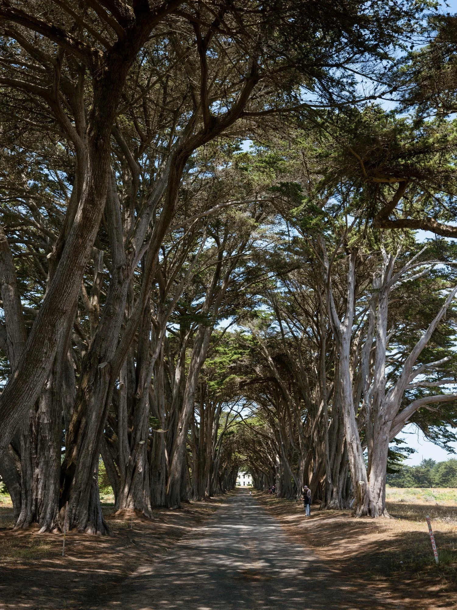 The gorgeous Monterey Cypress trees — now a tree tunnel — were planted way back in 1930 and line the path to the historic radio station end the end of the road.
