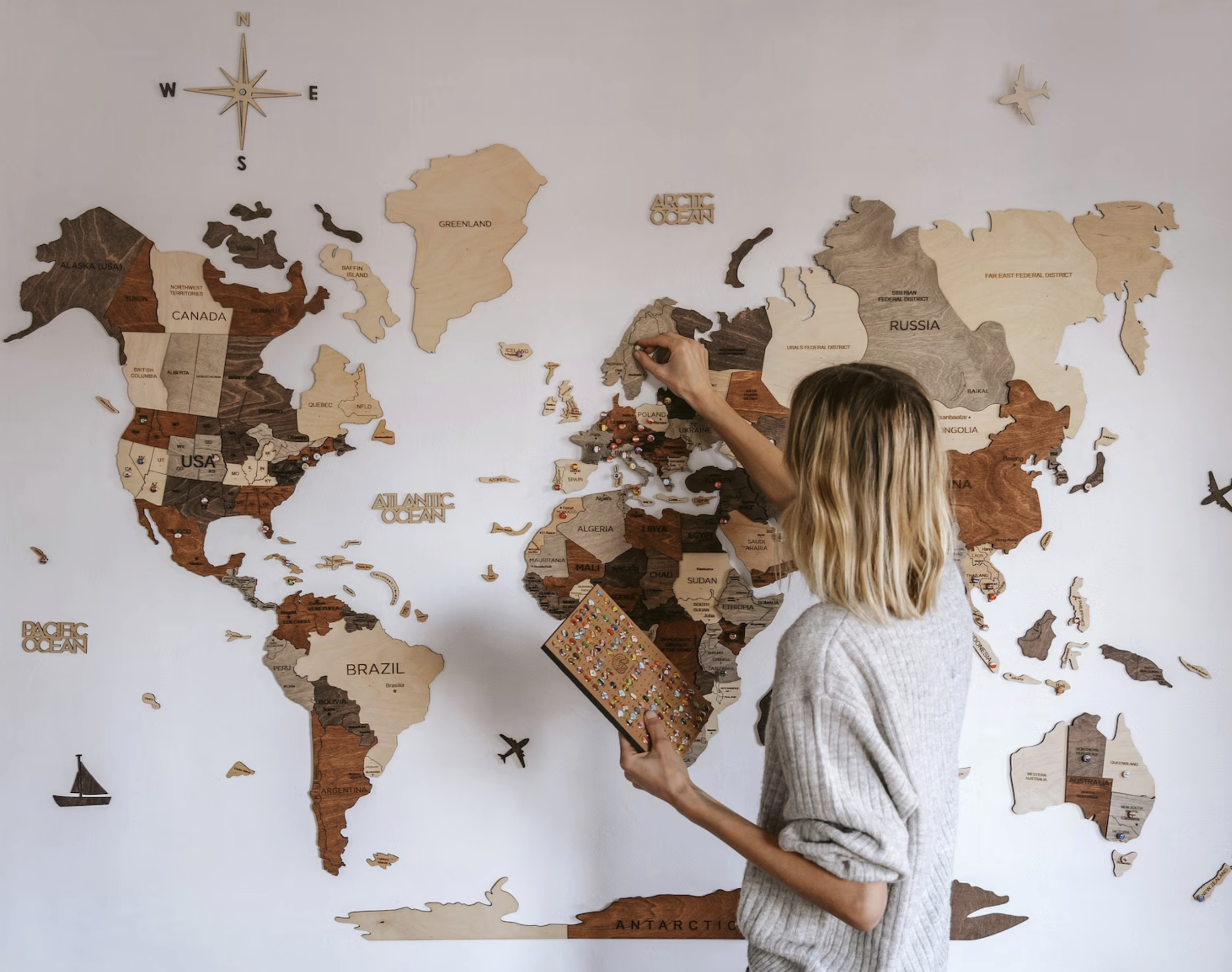 This is a beautiful wooden map for sticking onto a wall. You can get paper airplane-shaped pins or flag pins to be stuck into the countries and states they have been to!