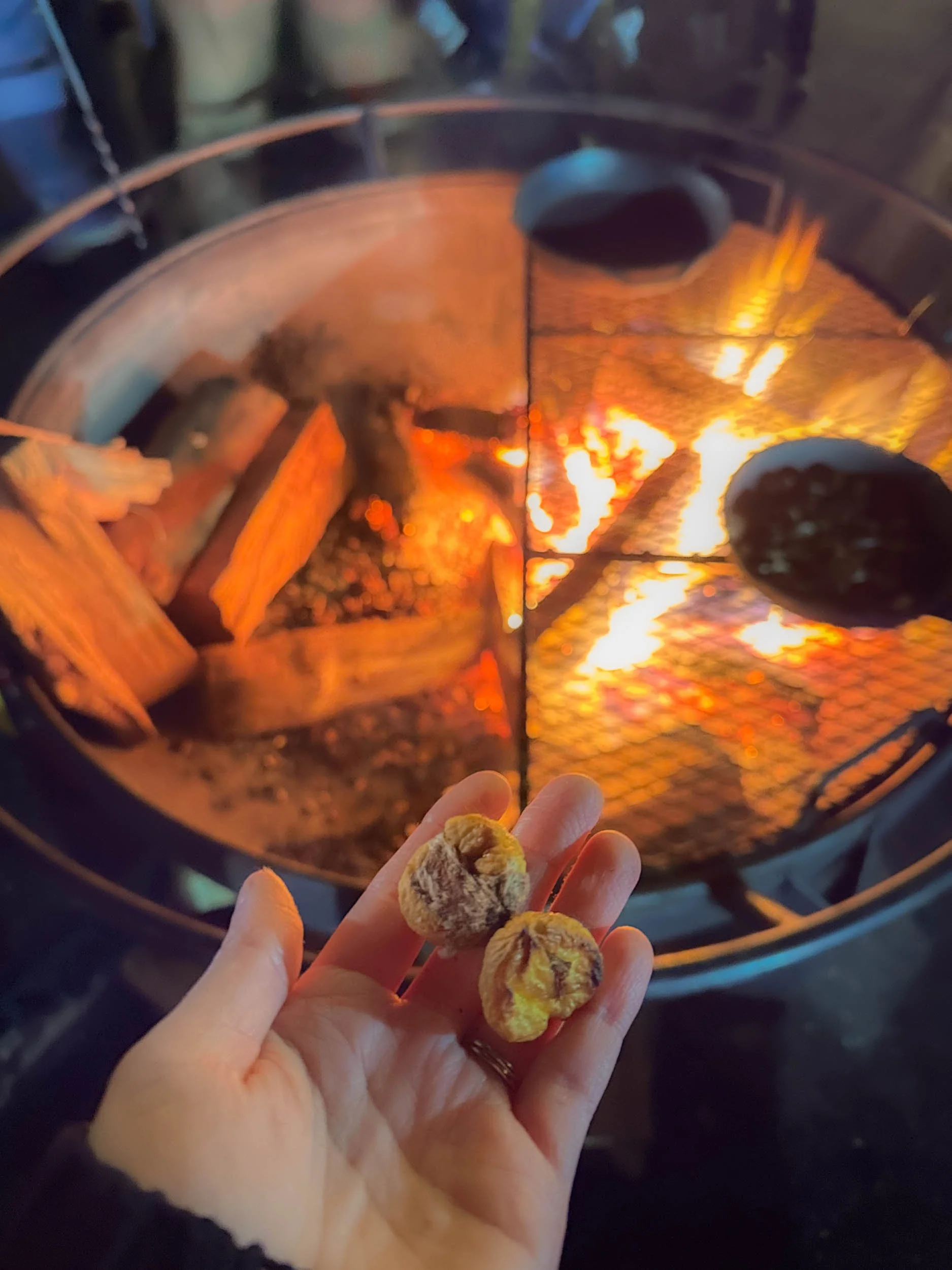 You may need to hang out for a bit to get one (or two) chestnuts, as they’re a popular attraction. Just enjoy the fire pit until the next round of chestnuts is roasted and passed around!
