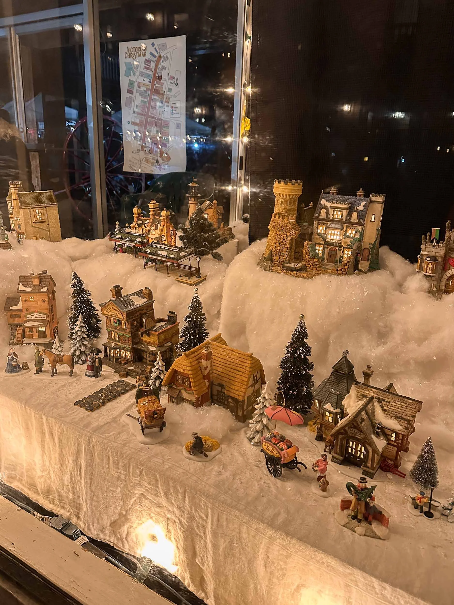 I wasn’t aware of this collection before visiting, but the Dickens Village display in the window quickly caught my eye as I walked by! It’s adorably set up with mini flocked trees and fake snow.