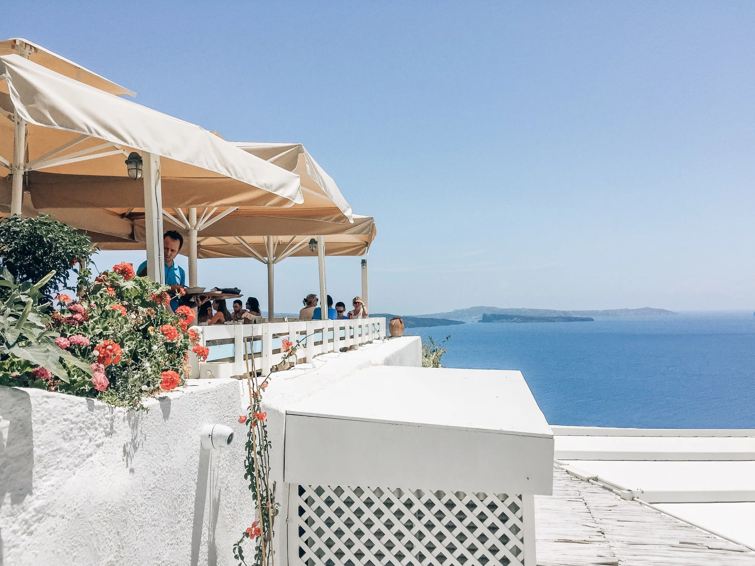When we first arrived in Oía after a long bus ride (more on that later), we walked through the town looking for a good lunch spot because we were starving. This place was pretty empty even though there were a lot of people and had unreal views looking over the ocean!
