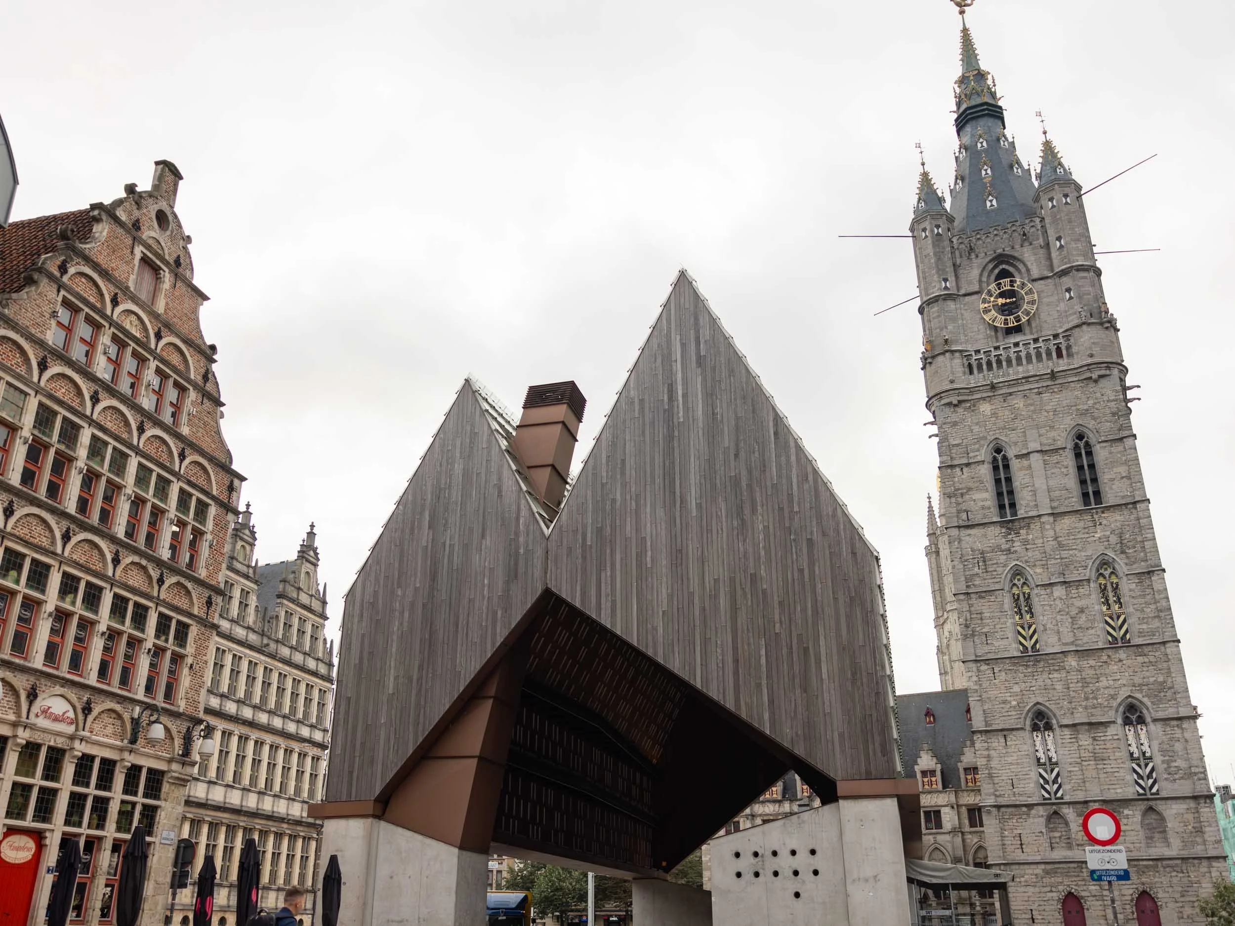 Stadshal is a unique and modern piece of architecture built in 2012 that has elicited mixed reviews. The sharp-angled, hyper-modern roof design sticks out among the medieval and historic buildings that surround it, which include the Belfry of Ghent
