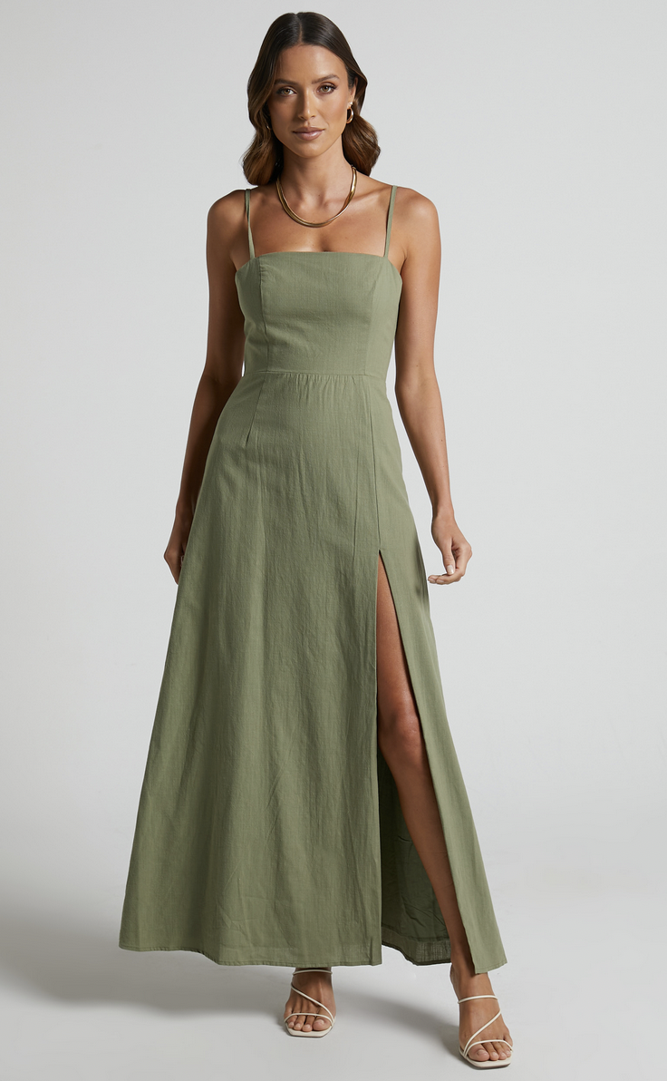 This 100% cotton dress is a beautiful sage color with a seam at the waist and leg slit. It has a nice square neckline with spaghetti straps, plus a zipper up the back.